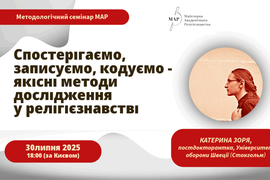 ГО “Майстерня академічного релігієзнавства” запрошує взяти участь у методологічному семінарі, де з доповіддю виступить Катерина Зоря, постдокторатка Університету оборони Швеції, PhD.